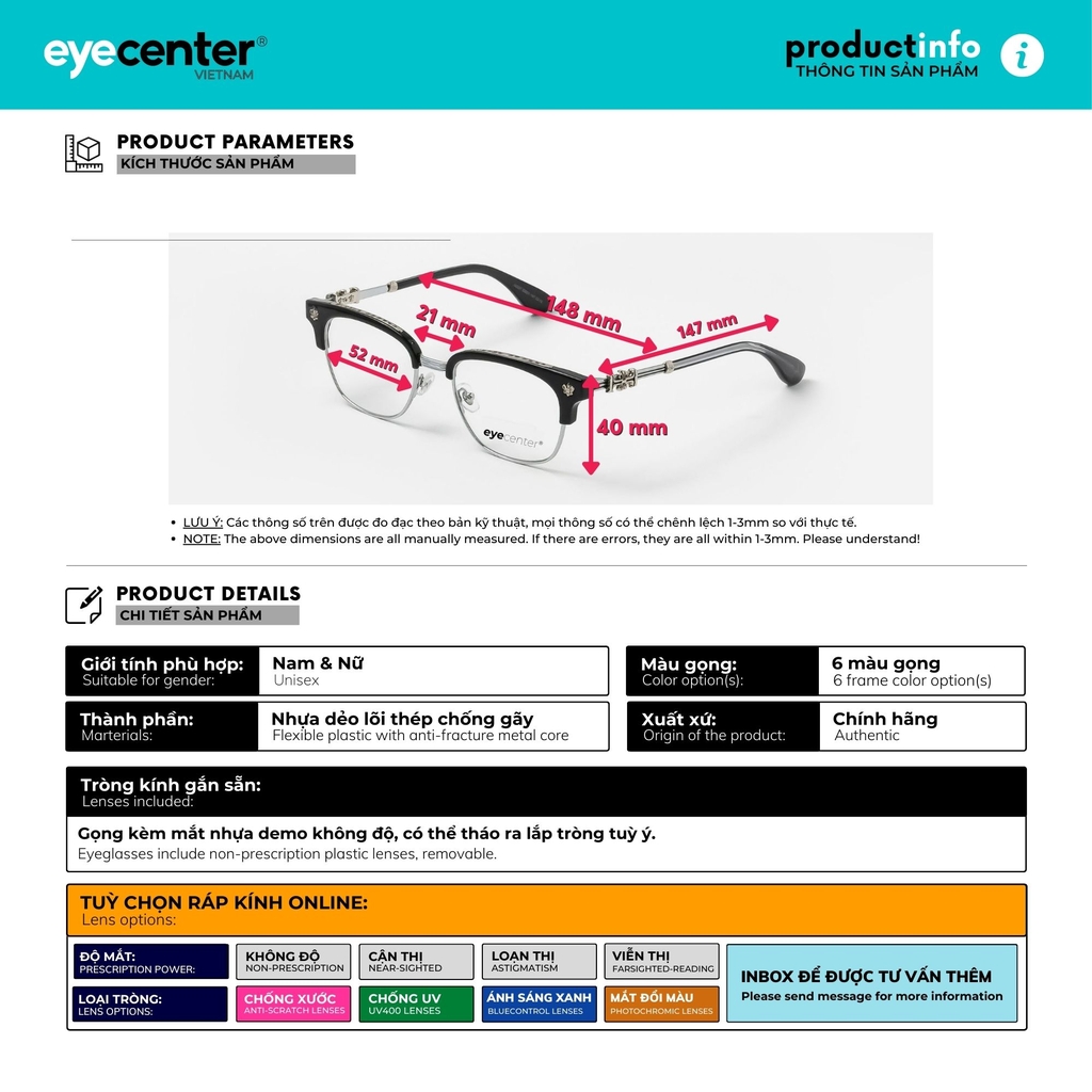 • Gọng có kèm tròng mica thường 0 độ. Có thể đeo thời trang chống bụi, hoặc ráp mắt độ cận thị, loạn thị, viễn thị, cận râm (cận màu), 0 độ các loại: Đổi màu, Chống Ánh Sáng Xanh, Chống UV400, Tráng cứng giảm xước... tùy ý.