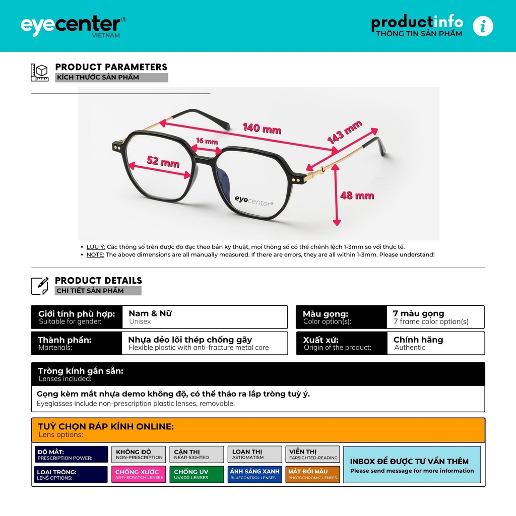 [B88] Gọng kính cận nam nữ chính hãng EYECENTER nhiều màu 8978