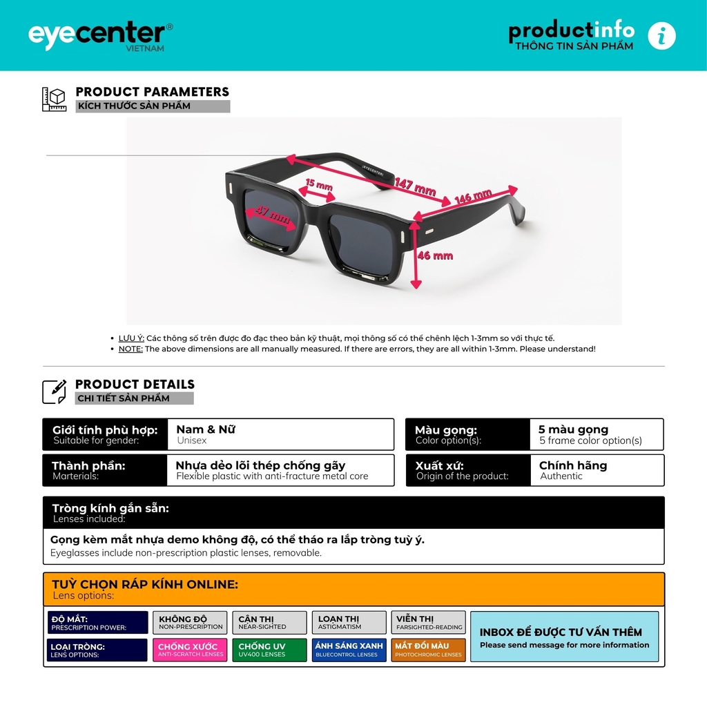 • Gọng có kèm tròng mica thường 0 độ. Có thể đeo thời trang chống bụi, hoặc ráp mắt độ cận thị, loạn thị, viễn thị, cận râm (cận màu), 0 độ các loại: Đổi màu, Chống Ánh Sáng Xanh, Chống UV400, Tráng cứng giảm xước... tùy ý.