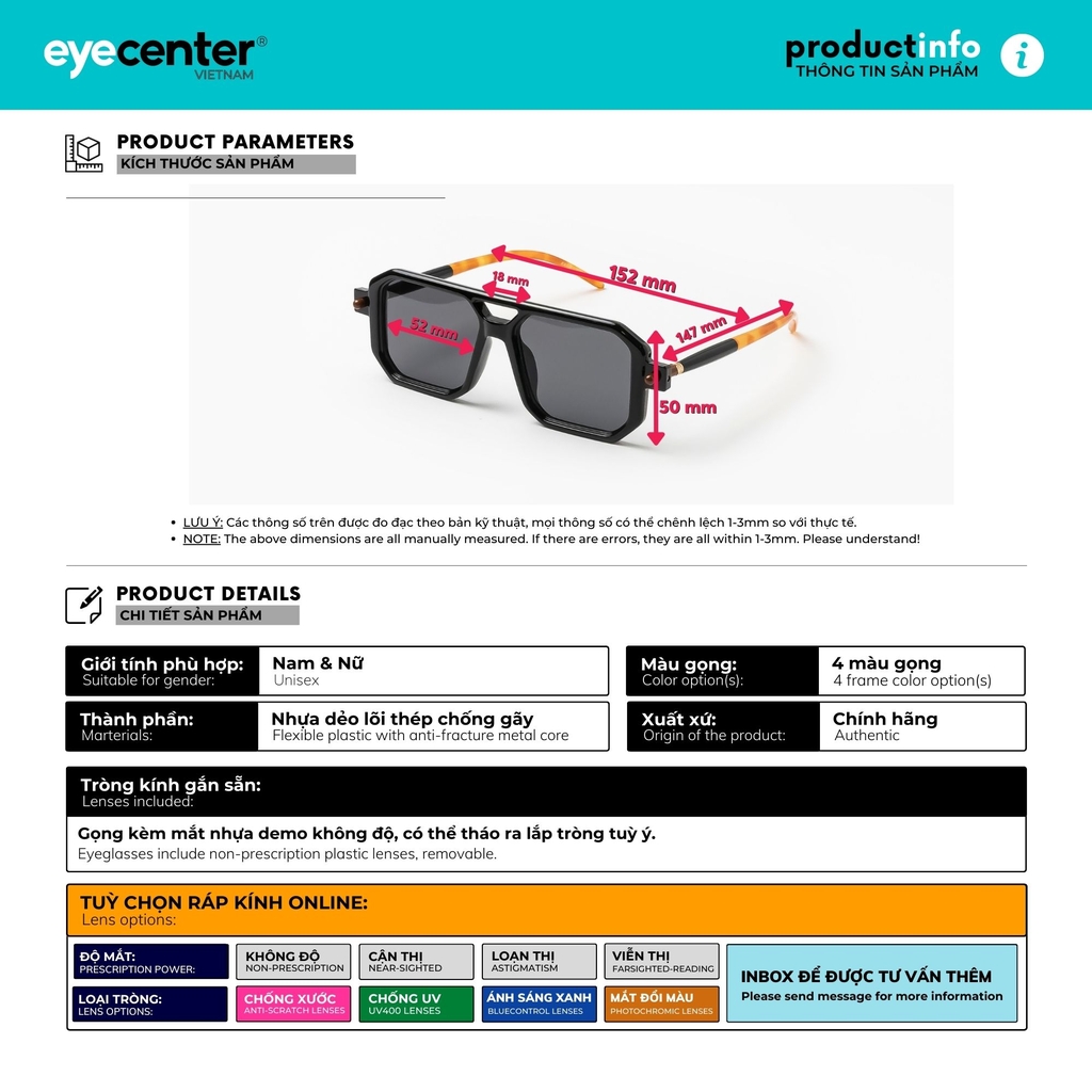 • Gọng có kèm tròng mica thường 0 độ. Có thể đeo thời trang chống bụi, hoặc ráp mắt độ cận thị, loạn thị, viễn thị, cận râm (cận màu), 0 độ các loại: Đổi màu, Chống Ánh Sáng Xanh, Chống UV400, Tráng cứng giảm xước... tùy ý.